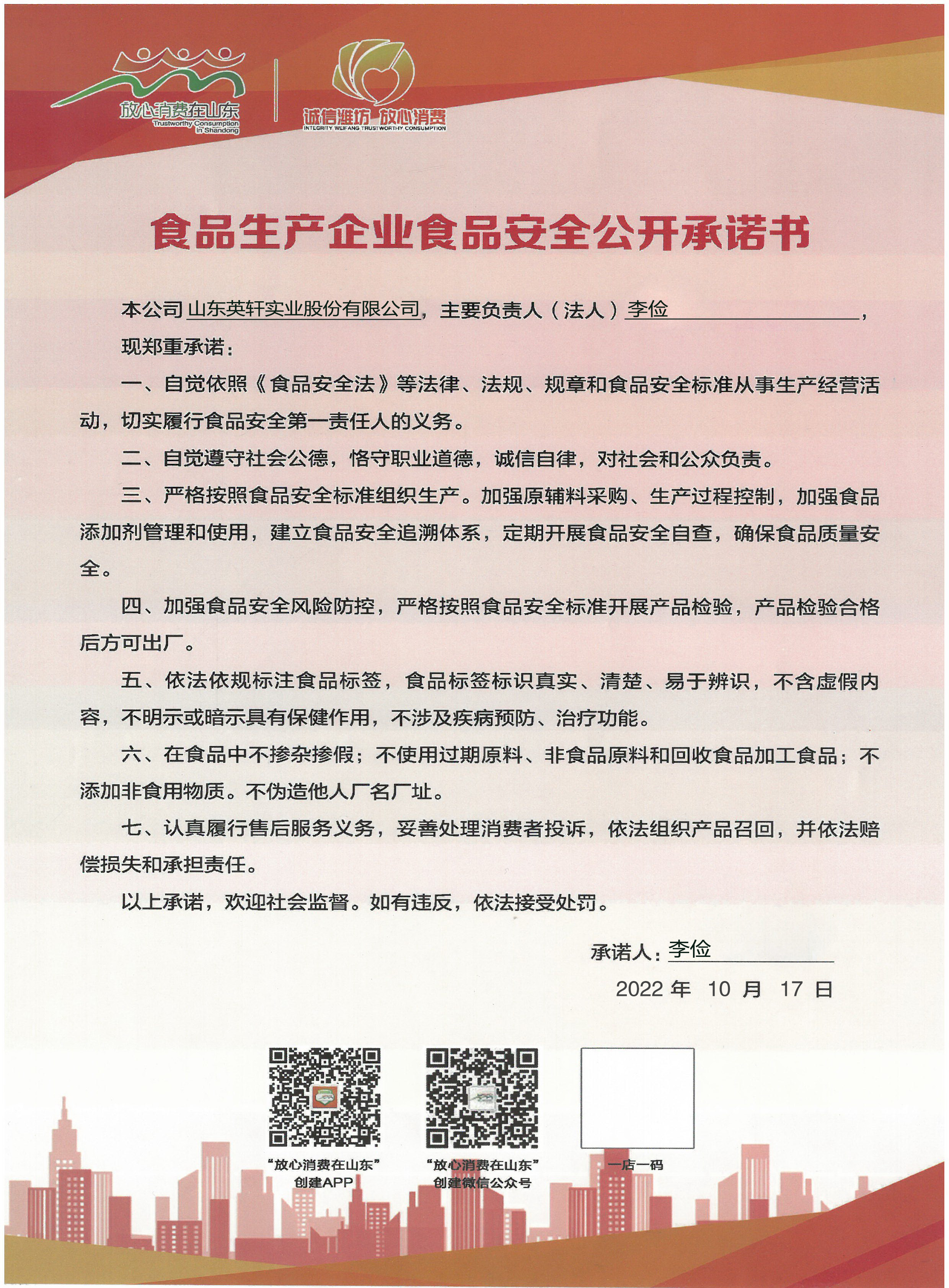 食品生产企业食品安全承诺书